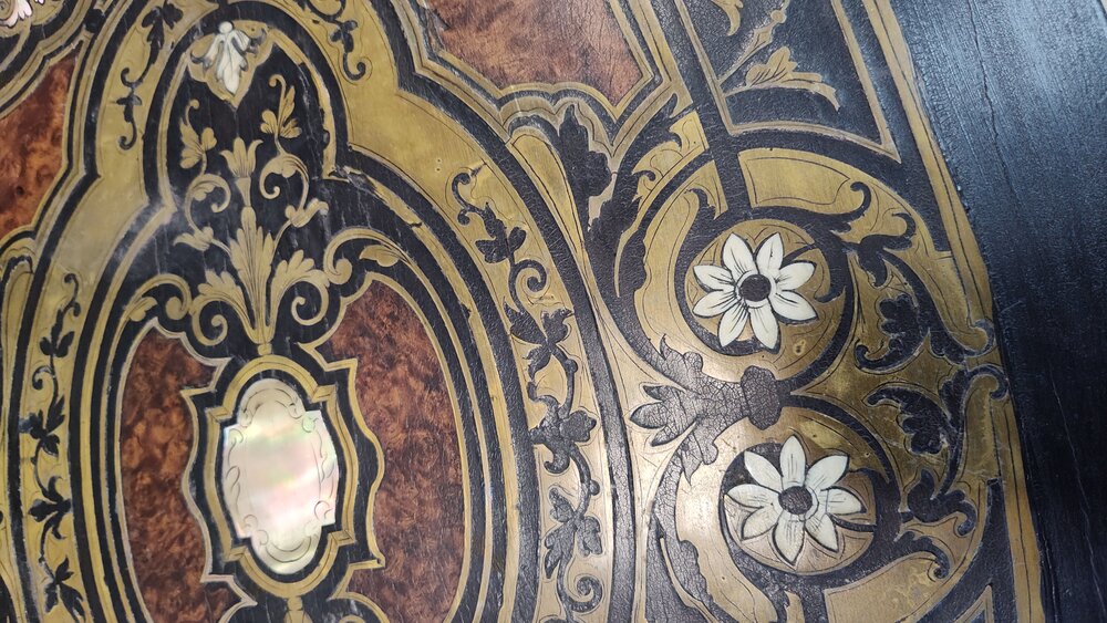 Sygnowana toaletka Jean-Pierre-Alexandre Tahan (1813-1892). Inkrustowana masą perłową, mosiądzem, kością oraz fornirowana hebanem i orzechem.