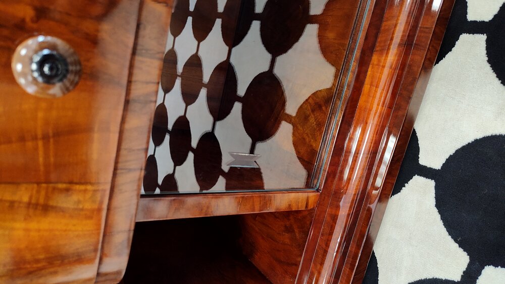 Przepiękny mebel w stylu Art Deco. Toaletka z dużym, fazowanym lustrem – elegancki mebel do stylowego lub nowoczesnego wnętrza. Po kompleksowej renowacji przeprowadzonej w naszej pracowni. Fornirowana orzechem, wykończona politurą na wysoki połysk. Lustro nowe, szyby z nacięciami wstawione na wymiar. Przy konstrukcji wklejone fragmenty polskiej gazety z 1913 roku.