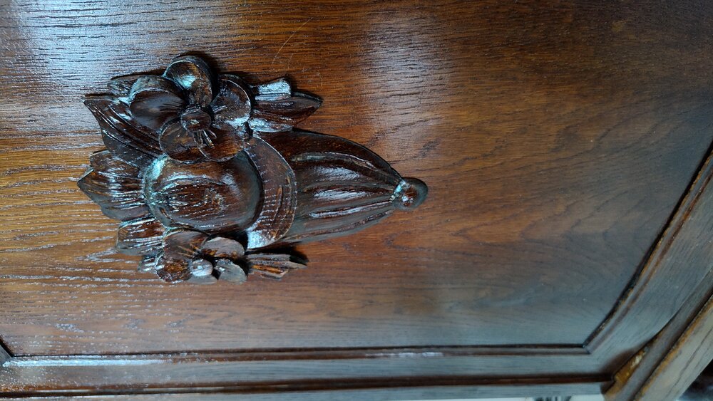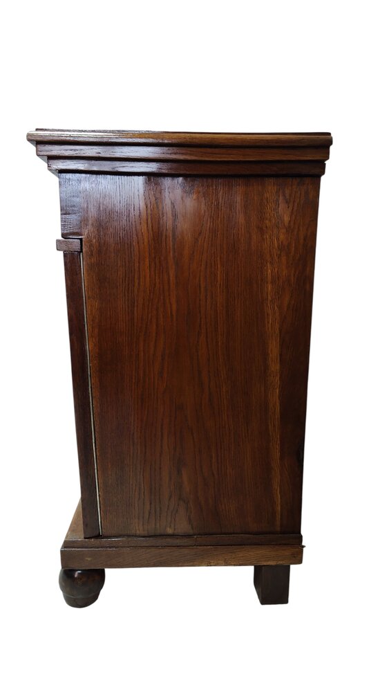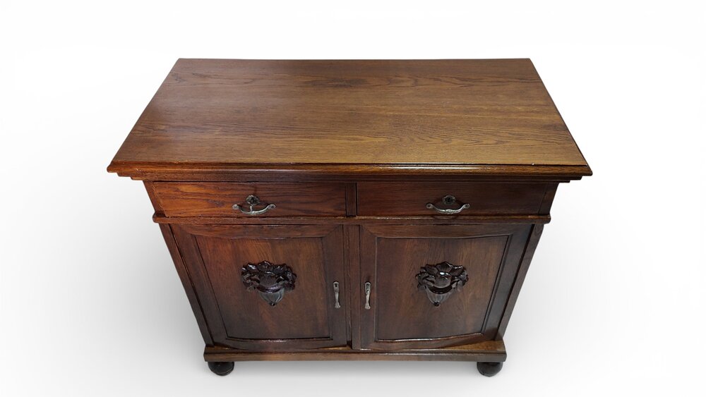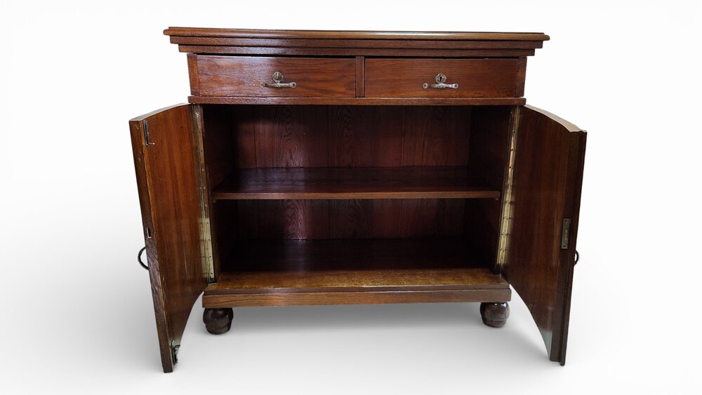 Na sprzedaż piękny mebel z dwudziestolecia międzywojennego - pomocnik/szafka/mały bufet. Solidny, po świeżo przeprowadzonej profesjonalnej renowacji. Może służyć jako szafka RTV pod telewizor. Dębowy fornir wykończony politurą w lekkim połysku. Piękny fornir, rzeźbienia. Komplet kluczy, zamki sprawne.